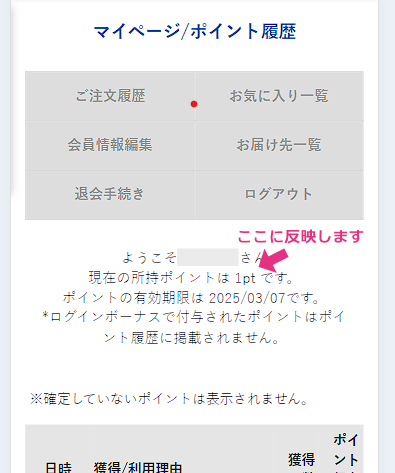 - ログインボーナスは、マイページの「ポイント履歴」には反映されません。