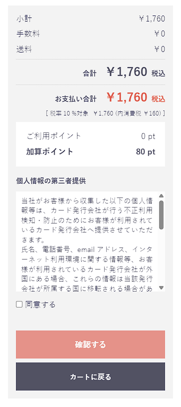 クレジット決済を選択した際、個人情報の同意についてのチェックが必要となります。不正利用を防ぐため、決済会社へ個人情報を提供する必要があります。第三者への情報提供に関する確認事項をお読みいただき、”同意する”のチェックボックスをタップしてください。チェック後、ご注文画面へ進めるようになります。